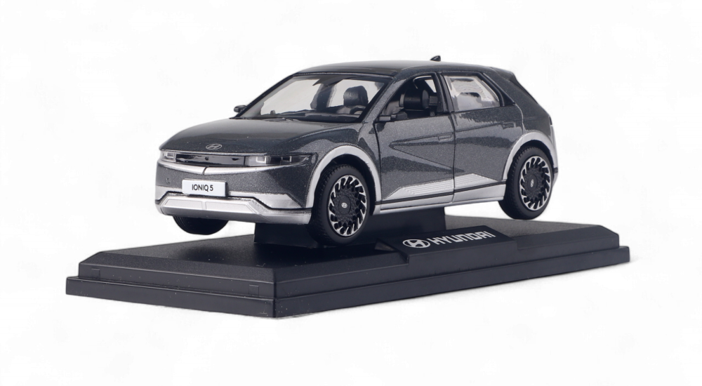 Якісна та оригінальна модель автомобіля Hyundai Ioniq 5 виконана в масштабі 1:38. Передні двері авто відчиняються. Модель виконана з металу та встановлена на пластикову підставку з логотипом Hyundai. Не є іграшкою для дітей.